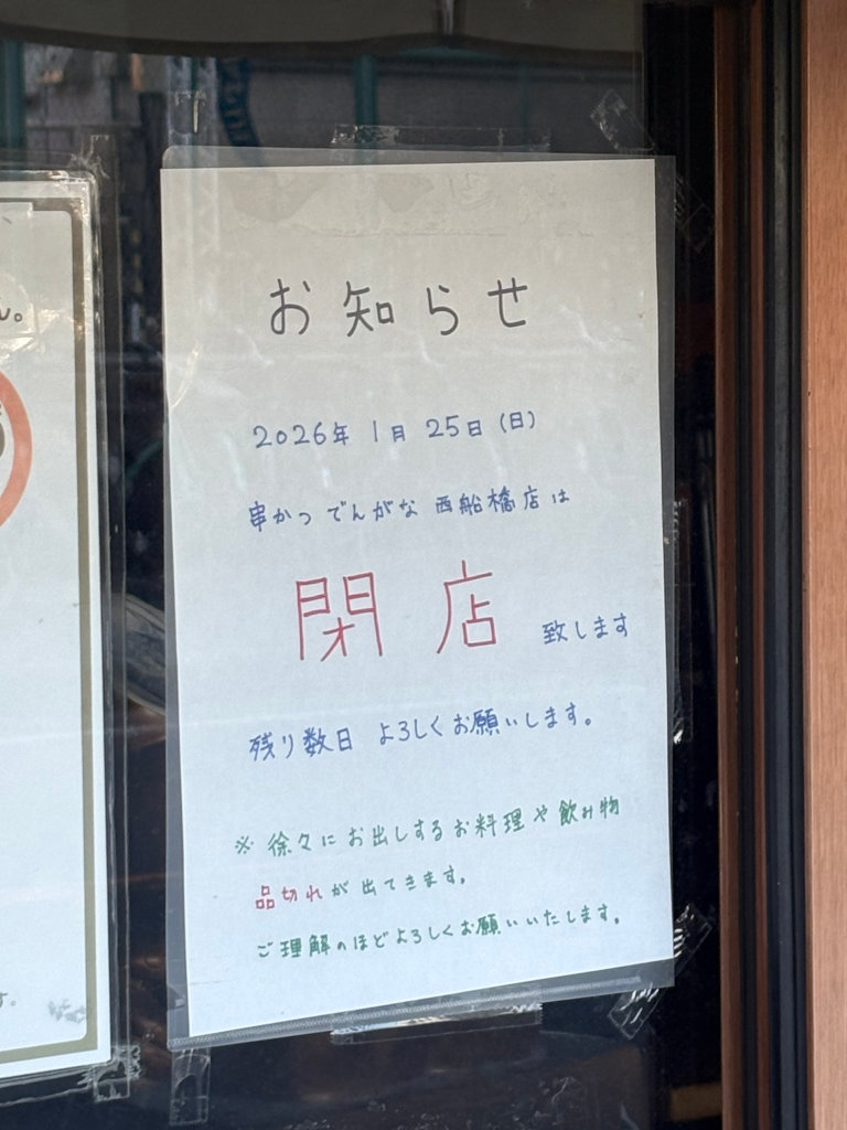 西船橋の「串かつでんがな」が閉店するらしい。 by ふなばっくす · 2026年1月20日 西船橋駅の南口を歩いていたら、串カツでんがな 西船橋店の店頭に貼り紙が出ていることに気がついた。 お知らせ 2026年1月25日(日) 串かつ でんがな 西船橋店は閉店致します 残り数日よろしくお願いします。 一応、西船橋串カツ対決は、西船橋駅北口の「串カツ 田中」の勝利といったところだろうか。 串カツでんがな 西船橋店の外観 串カツでんがな 西船橋店の閉店のお知らせ 関連